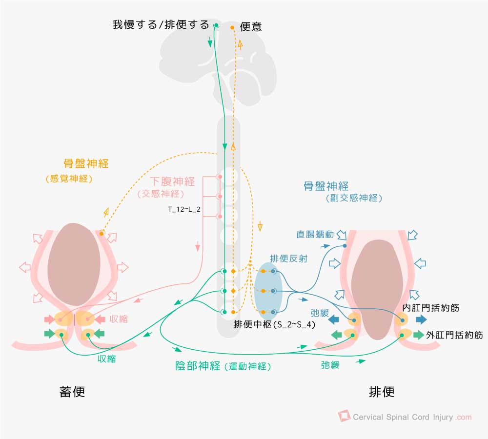 頚髄損傷では、便意は消失し(感覚麻痺)、外肛門括約筋をコントロールできなくなり、腹圧をかけることもできません(運動麻痺)。腸の運動に関しては副交感神経が一部をのぞき残存しているため、おおむね機能しているといえますが、通常と比べ低下しており、便の通過時間が2倍ほどかかるといわれています。しかしながら、直腸の内圧が高まると内肛門括約筋が弛緩する排便反射が維持されていれば、下剤や座薬等の刺激を利用した排便が有効になります。